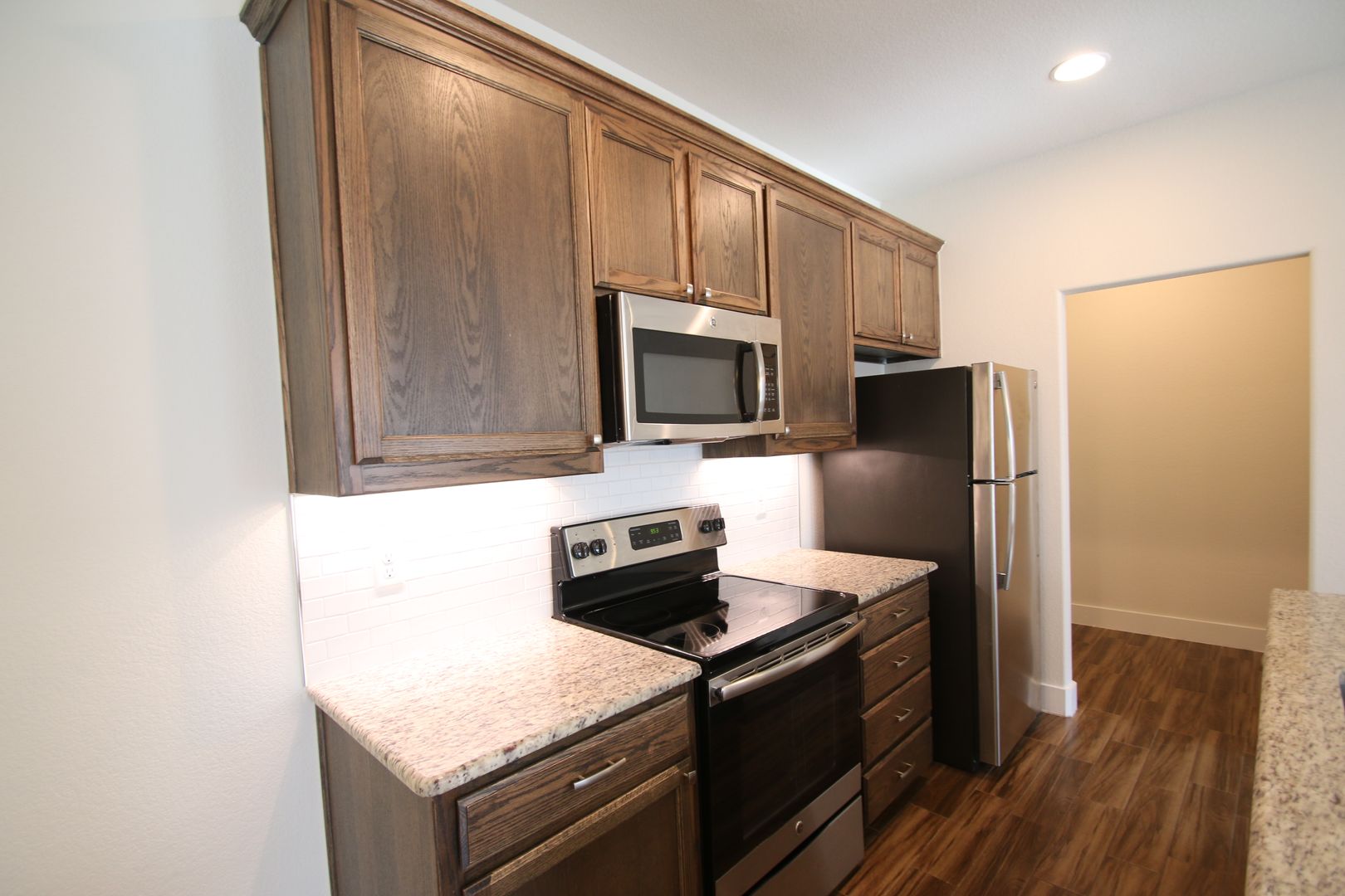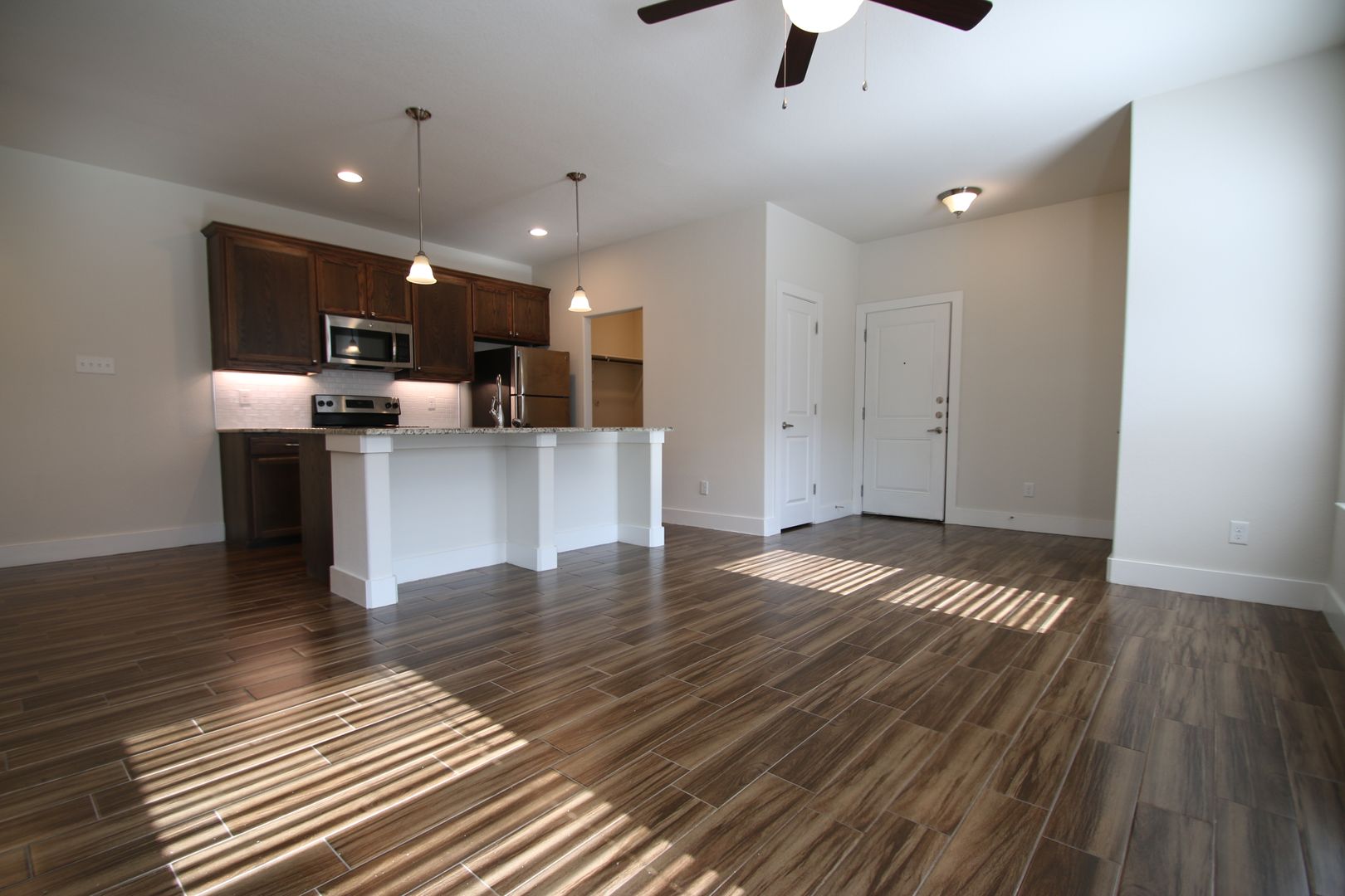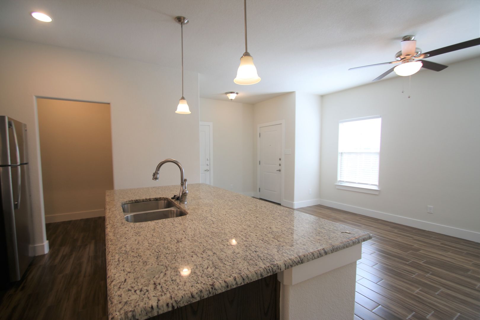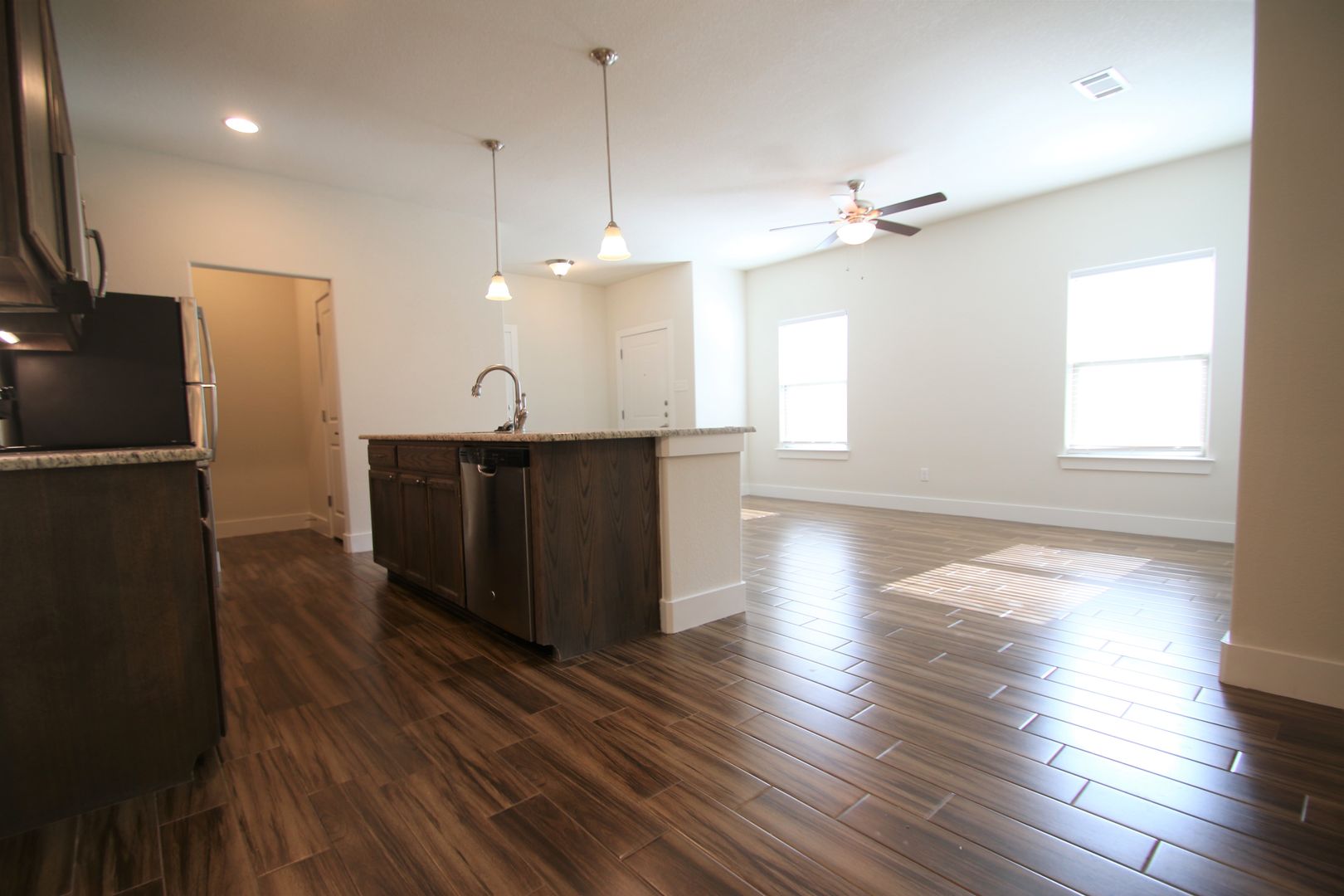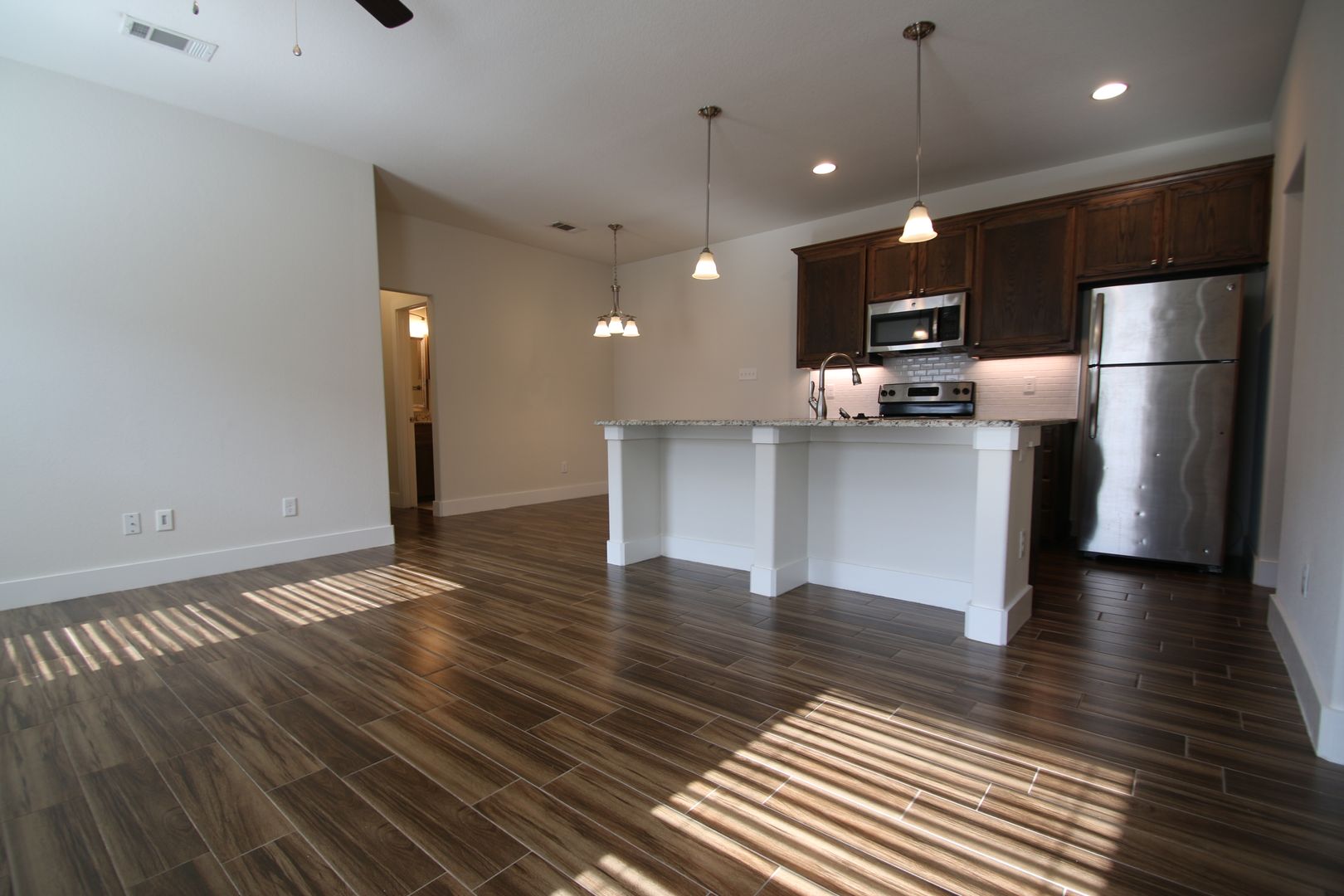This fabulous home is both stylish and functional. It features three bedrooms and two bathrooms, along with a two-car garage equipped with a remote. The interior boasts beautiful hardwood-like tile, granite countertops, custom-built cabinets, and stainless steel appliances. Additionally, there is a private fenced backyard for outdoor enjoyment. Each bedroom comes with comfortable ceiling fans and neutral-colored carpets and ample closet space.