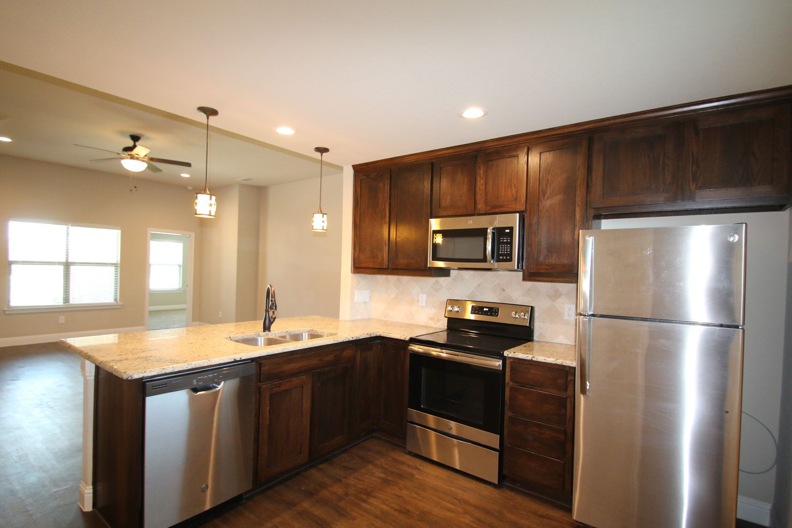 The Kitchen - The chef in the family will love the custom cabinetry, granite countertops, custom tile backsplash, and oversized pantry. Every stainless steel appliance is included — refrigerator, flat cooktop stove/oven, built-in microwave, dishwasher, and garbage disposal.