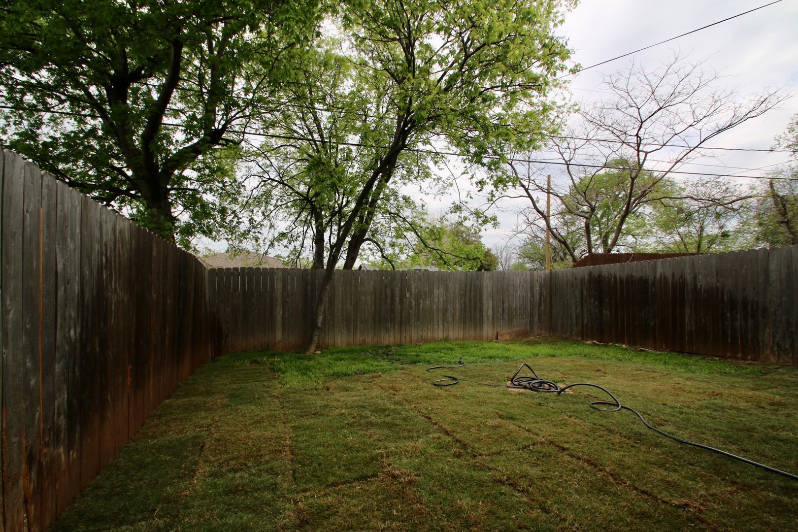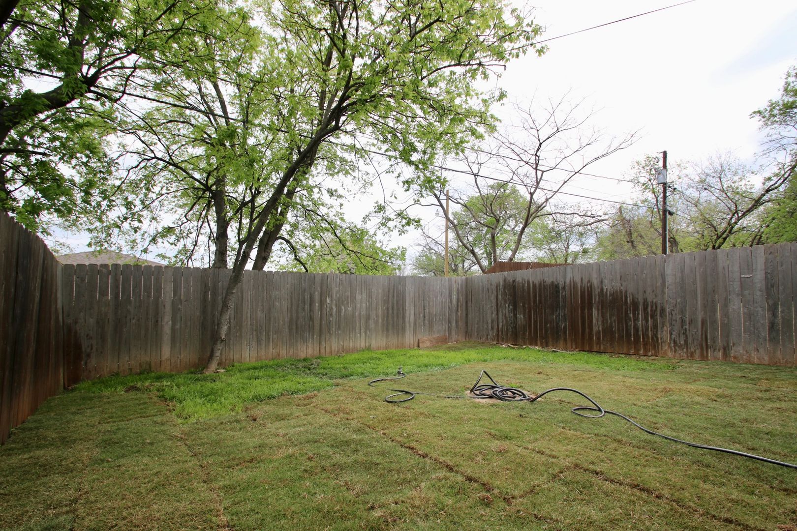 Large backyard with mature trees, patio area, and plenty of space for outdoor activities